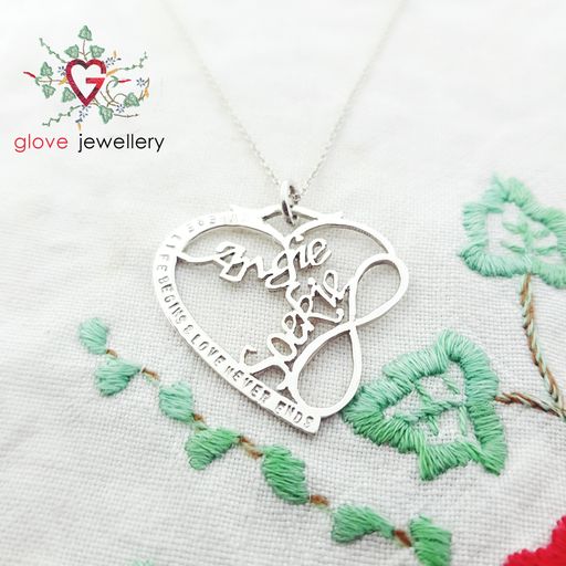 Our heart and infinity necklace is handmade in sterling silver, the pendant size is 27mm x 27mm. Please specify the name/s you want on the pendant under the notes section when checking out. We will send your design over for your approval first before starting on your order.