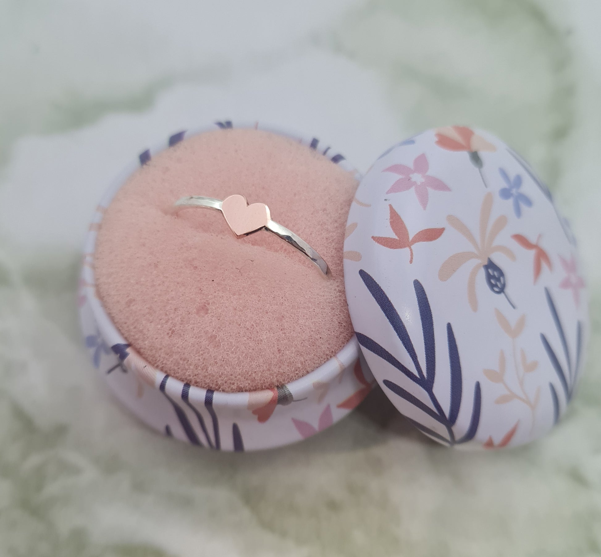 This combination metal ring is made from Sterling Silver and Copper. Each little heart is hand cut in Copper and completed with a Sterling Silver shank. Even though this ring looks fine it is super durable and it will last. It comes in a very cute little tin. Please note tin may differ from the photo.